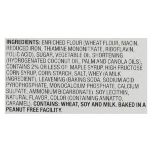 ingredients : enriched flour;wheat flour;niacin;reduced iron;thiamine mononitrate;riboflavin;folic acid;sugar;vegetable oil shortening;hydrogenated coconut oil;palm and canola oils;contains 2% or less of: maple syrup;high fructose corn syrup;corn starch;s alt;whey;a milk ingredient;leavening;baking soda;sodium acid pyrophosphate;monocalcium phosphate;calcium sulfate;ammonium bicarbonate;soy lecithin;natural flavor;color;containing annatto;caramel
