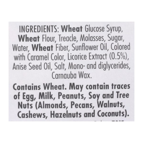ingredients : wheat glucose syrup;wheat flour;treacle;molasses;sugar;water;wheat fiber;sunflower oil;colored with caramel color;licorice extract (0.5%);anise seed oil;salt;mono- and diglycerides;carnauba wax