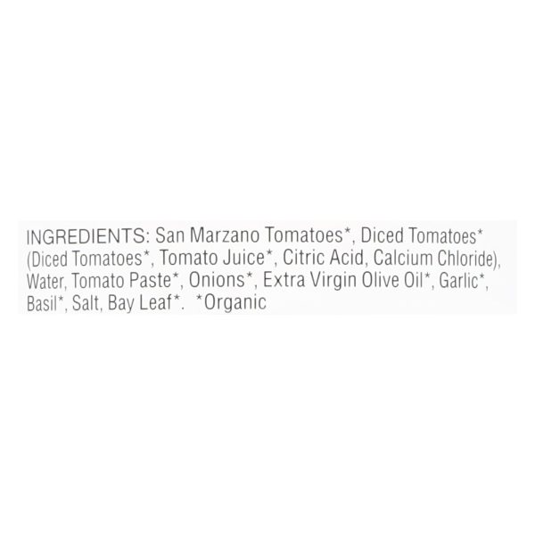 ingredients : san marzano tomatoes;diced tomatoes* (diced tomatoes*, tomato juice*, citric acid, calcium chloride);water;tomato paste;onions;extra virgin olive oil;garlic;basil;salt;bay leaf