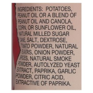 ingredients : potatoes;peanut oil or a blend of peanut oil and canola;corn;or sunflower oil;natural milled sugar cane;salt;dextrose;tomato powder;natural flavors;onion powder;spices;natural smoke powder;autolyzed yeast extract;paprika;garlic powder;citric acid;extractive of paprika