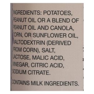 ingredients : potatoes;peanut oil or a blend of peanut oil and canola;corn;or sunflower oil;maltodextrin;derived from corn;salt;lactose;malic acid;vinegar;citric acid;sodium citrate