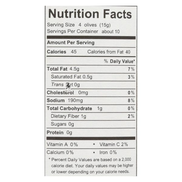 Divina, olives, organic kalamata pitted are organic and non-gmo. This product comes to you in a convenient, easy-to-open glass jar. Each four olive serving contains 45 calories and 7% of recommended daily value of fat. Divina, olives, organic kalamata pitted are a great addition to any meal, snack or vegetable tray. Every jar of divina, olives, organic kalamata pitted contains 10.2 oz. Of product. This product is manufactured in a facility that also processes milk. Please see nutritional facts panel for information concerning possible allergens or warnings associated with this product.