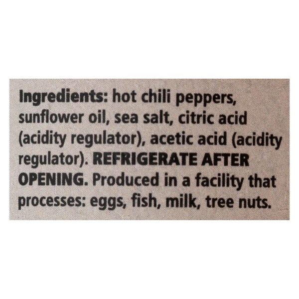 ingredients : hot chili peppers;sunflower oil;sea salt;citric acid;acidity regulator;acetic acid