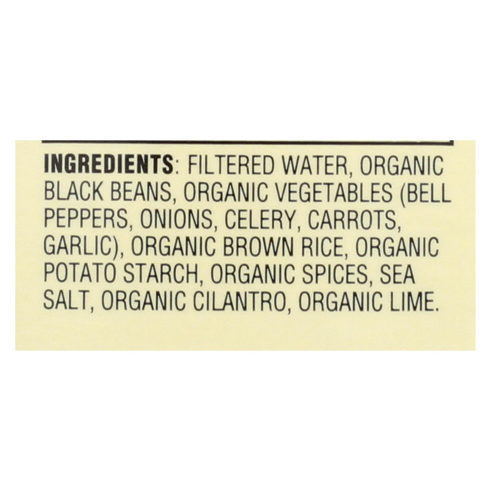 ingredients : filtered water;organic black beans;organic vegetables;bell peppers;onions;celery;carrots;garlic;organic brown rice;organic potato starch;organic spices;sea salt;organic cilantro;organic lime