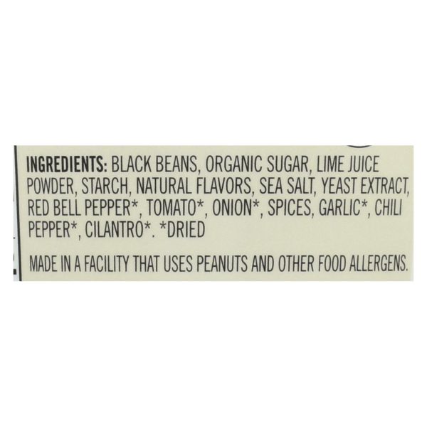 ingredients : black beans;organic sugar;lime juice powder;starch;natural flavors;sea salt;yeast extract;red bell pepper;tomato;onion;spices;garlic;chili pepper;cilantro