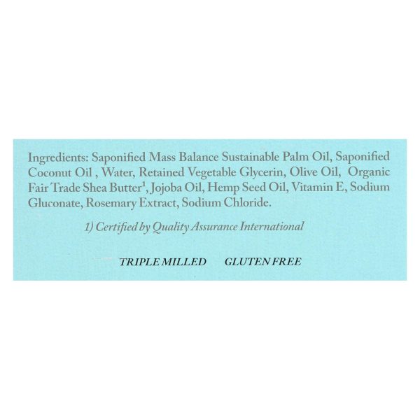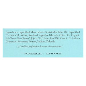 ingredients : saponified mass balance sustainable palm oil;saponified coconut oil;water;retained vegetable glycerin;olive oil;organic fair trade shea butter¹;jojoba oil;hemp seed oil;vitamin e;sodium gluconate;rosemary extract;sodium chloride