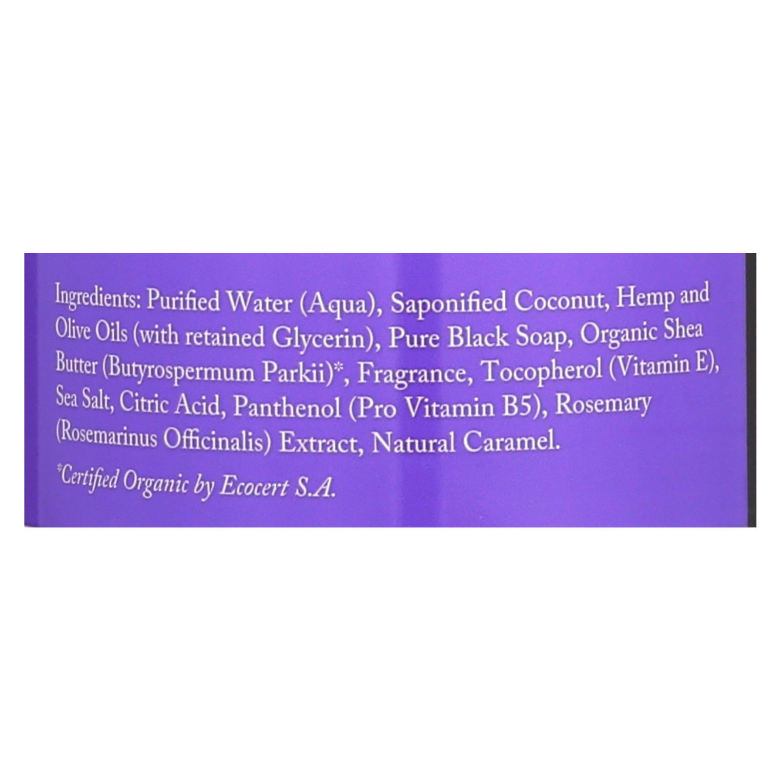 ingredients : purified water;aqua;saponified coconut;hemp and olive oils;with retained glycerin;pure black soap;organic shea butter;butyrospermum parkii;fragrance;tocopherol;vitamin e;sea salt;citric acid;panthenol;pro vitamin b5;rosemary;rosemarinus officinalis;extract;natural caramel
