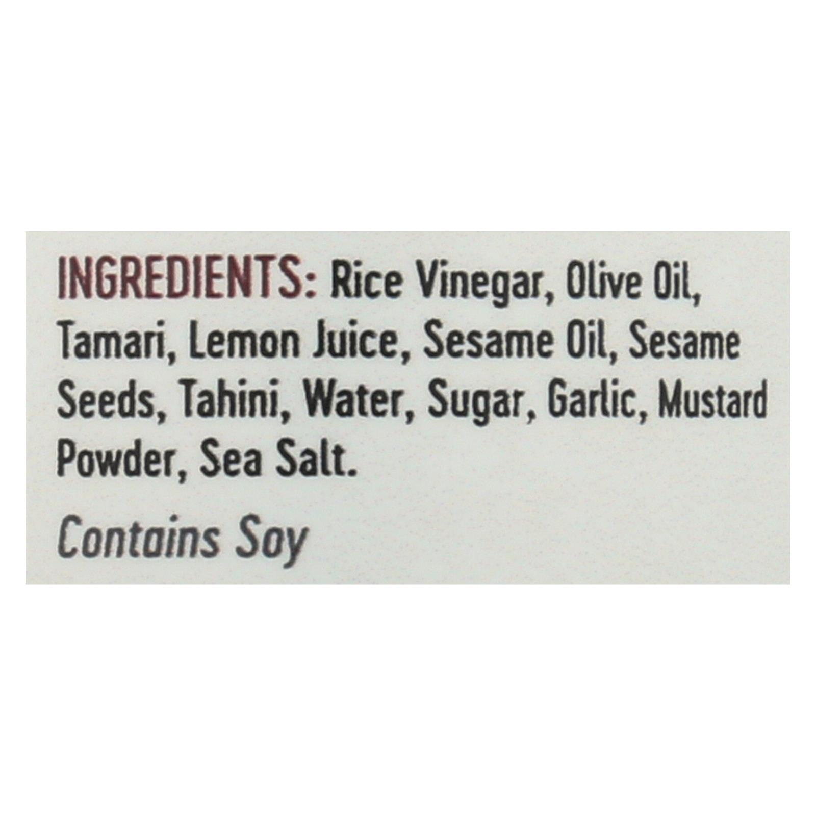 ingredients : rice vinegar, olive oil, tamari, sesame oil, lemon juice, sesame seeds, tahini, water, sugar, garlic, mustard powder, sea salt.