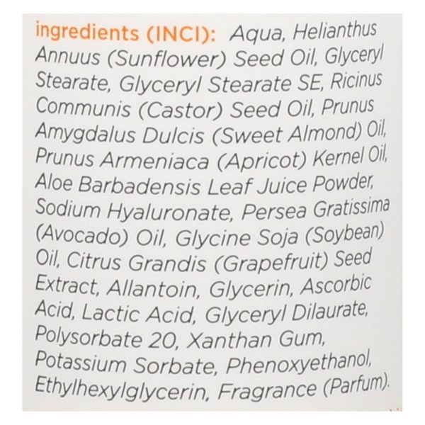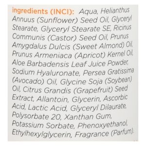 ingredients : inci;: aqua;helianthus annuus;sunflower;seed oil;glyceryl stearate;glyceryl stearate se;ricinus communis;castor;prunus amygdalus dulcis;sweet almond;oil;prunus armeniaca;apricot;kernel oil;aloe barbadensis leaf juice powder;sodium hyaluronate;persea gratissima;avocado;glycine soja;soybean;citrus grandis;grapefruit;seed extract;allantoin;glycerin;ascorbic acid;lactic acid;glyceryl dilaurate;polysorbate;phenoxyethanol;ethylhexylglycerin;fragrance;parfum