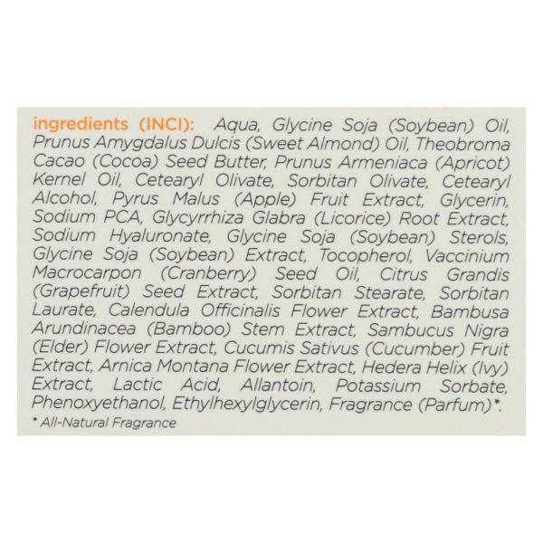 ingredients : inci;: aqua;glycine soja;soybean;oil;prunus amygdalus dulcis;sweet almond;theobroma cacao;cocoa;seed butter;prunus armeniaca;apricot;kernel oil;cetearyl olivate;sorbitan olivate;cetearyl alcohol;pyrus malus;apple;fruit extract;glycerin;sodium pca;glycyrrhiza glabra;licorice;root extract;sodium hyaluronate;sterols;extract;tocopherol;vaccinium macrocarpon;cranberry;seed oil;citrus grandis;grapefruit;seed extract;sorbitan stearate;sorbitan laurate;calendula officinalis flower extract;bambusa arundi