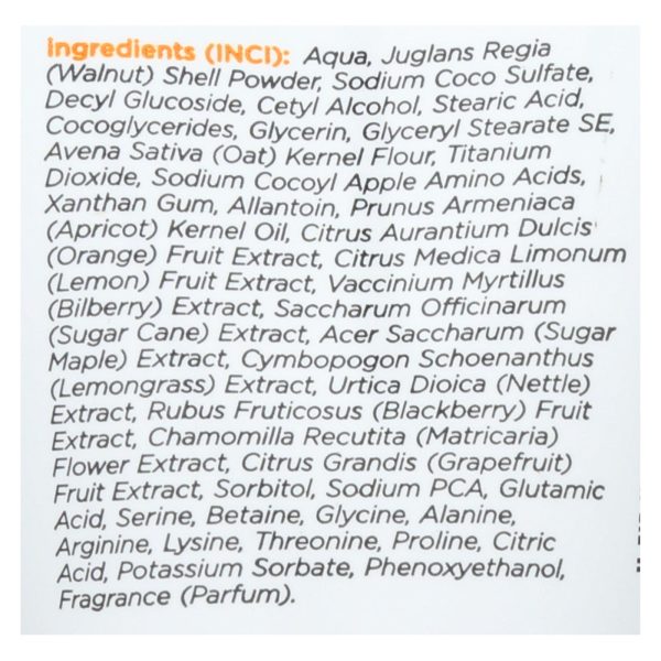 ingredients : aqua;juglans regia;walnut;shell powder;sodium coco sulfate;decyl glucoside;cetyl alcohol;stearic acid;cocoglycerides;glycerin;glyceryl stearate se;palmitic acid;avena sativa;oat;kernel flour;sodium cocoyl apple amino acids;xanthan gum;allantoin;prunus armeniaca;apricot;kernel oil;citrus aurantium dulcis;orange;fruit extract;citrus medica limonum;lemon;saccharum officinarum;sugar cane;extract;acer saccharum;sugar maple;cymbopogon schoenanthus;lemongrass;urtica dioica;nettle;chamomilla recutita;ma