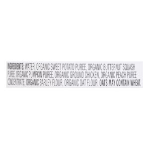 ingredients : water;organic sweet potato puree;organic butternut squash puree;organic pumpkin puree;organic ground chicken;organic peach puree concentrate;organic barley flour;organic oat flour