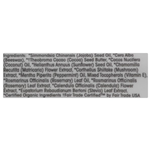 Nutrient-dense organic lip balm. Usda organic. Certified organic by oregon tilth. Www.tilth.org. Gluten free. Invigorates & moisturizes for a smooth, full look. Fair trade certified ingredient. 20% fair trade certified ingredients. Www.ecolips.com. Certified b corporation. Cruelty free. 100% renewable offset with sustainable power. Made in usa.