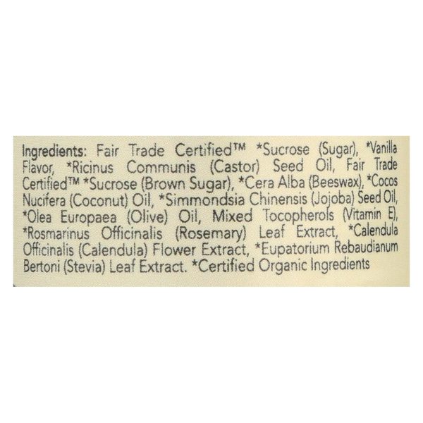 ingredients : fair trade certified™ *sucrose;sugar;vanilla flavor;ricinus communis;castor;seed oil;brown sugar;cera alba;beeswax;cocos nucifera;coconut;oil;simmondsia chinensis;jojoba;olea europaea;olive;mixed tocopherols;vitamin e;rosmarinus officinalis;rosemary;leaf extract;calendula officinalis;calendula;flower extract;eupatorium rebaudianum bertoni;stevia