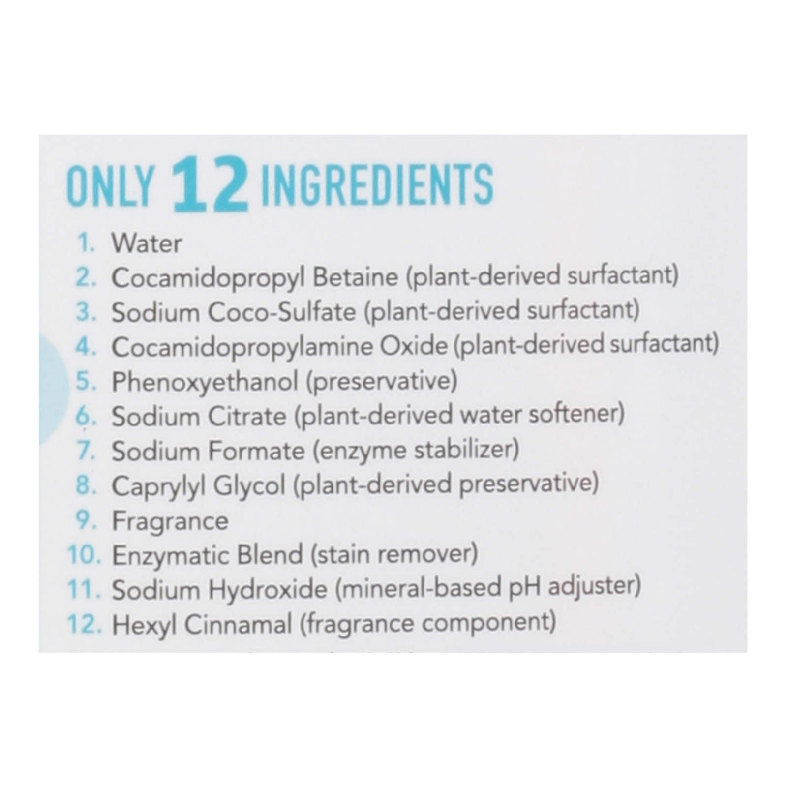 ingredients : 1;water 2;cocamidopropyl betaine (plant-derived surfactant) 3;sodium coco-sulfate (plant-derived surfactant) 4;cocamidopropylamine oxide (plant-derived surfactant) 5;phenoxyethanol (preservative) 6;sodium citrate (plant-derived water softener) 7;sodium formate (enzyme stabilizer) 8;caprylyl glycol (plant-derived preservative) 9;fragrance 10;enzymatic blend (stain remover) 11;sodium hydroxide (mineral-based ph adjuster) 12;hexyl cinnamal (fragrance component)