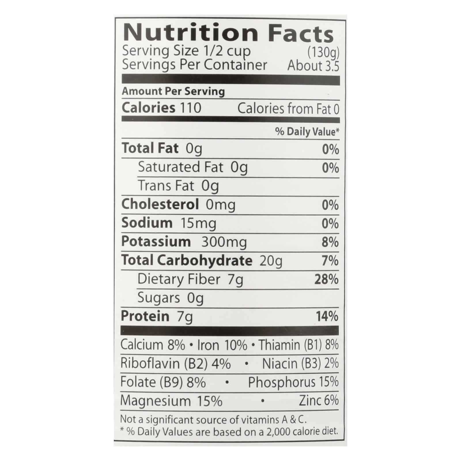 Eden foods canned navy beans are ocia certified organic and certified kosher-parve. A 1/2-cup serving of eden foods navy beans provides 7 g. Of protein, 7 g. Of dietary fiber, 15% each of the daily recommended values of phosphorus and magnesium, 10% of the daily recommended value of iron and 8% each of the daily recommended values of potassium, calcium, folate and thiamin. Eden foods navy beans contain 0 g. Of fat, 0 mg. Of cholesterol, 0 g. Of sugars and just 15 mg. Of sodium per serving.