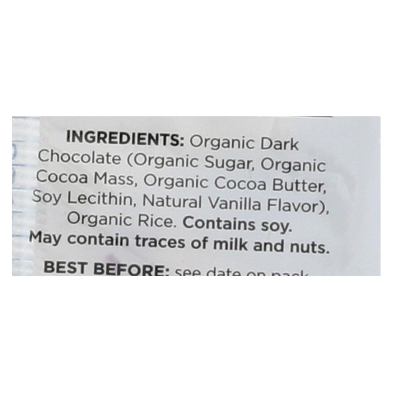 ingredients : organic dark chocolate (organic sugar, organic cocoa mass, organic cocoa butter, soy lecithin, natural vanilla flavor);organic rice