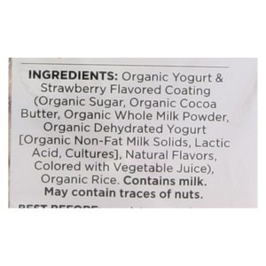 ingredients : organic yogurt & strawberry flavored coating;organic sugar;organic cocoa butter;organic whole milk powder;organic dehydrated yogurt [organic non-fat milk solids;lactic acid;cultures];natural flavors;colored with vegetable juice;organic rice
