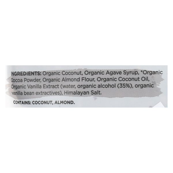 ingredients : organic coconut;organic agave syrup;organic cocoa powder;organic almond flour;organic coconut oil;organic vanilla extract;water;organic alcohol;35%;organic vanilla bean extractives;himalayan salt
