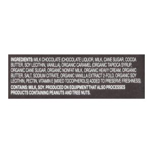 ingredients : milk chocolate (chocolate liquor, milk, cane sugar, cocoa butter, soy lecithin, vanilla);organic caramel (organic tapioca syrup, organic cane sugar, organic nonfat milk, organic heavy cream, organic butter, salt, sodium citrate, organic vanilla extract 2-fold, organic soy lecithin, pectin, vitamin e [mixed tocopherols] added to preserve freshness)