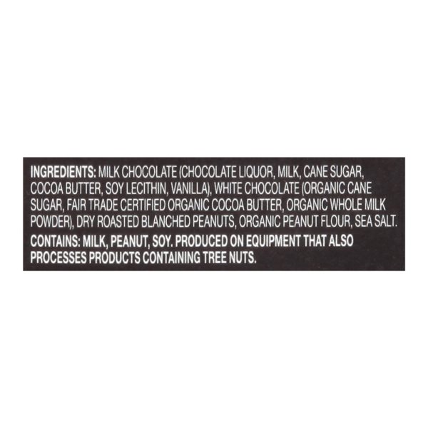 ingredients : milk chocolate (chocolate liquor, milk, cane sugar, cocoa butter, soy lecithin, vanilla);white chocolate (organic cane sugar, fair trade certified organic cocoa butter, organic whole milk powder);dry roasted blanched peanuts;organic peanut flour;sea salt