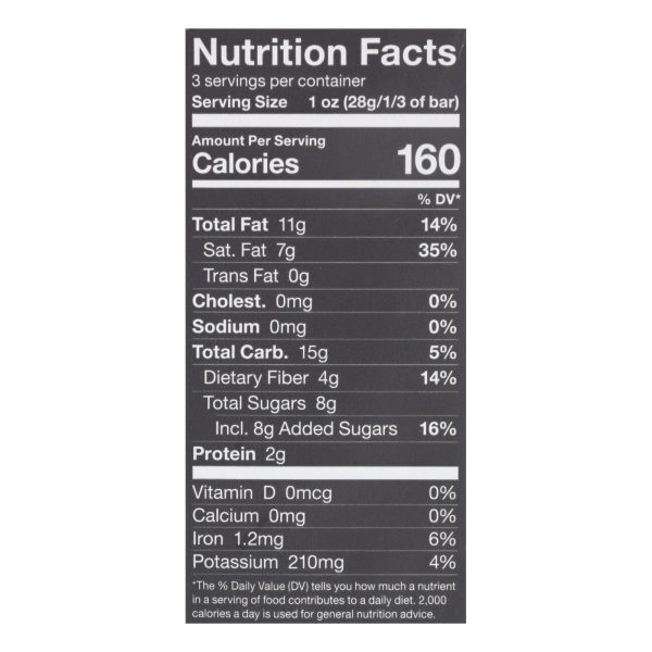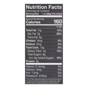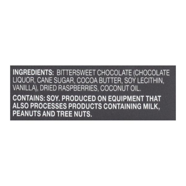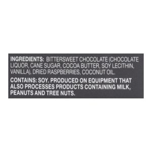 ingredients : bittersweet chocolate (chocolate liquor, cane sugar, cocoa butter, soy lecithin, vanilla);dried raspberries;coconut oil
