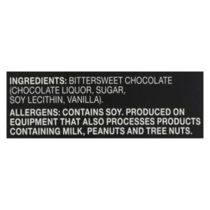 ingredients : bittersweet chocolate (chocolate liquor, cane sugar, soy lecithin, vanilla)