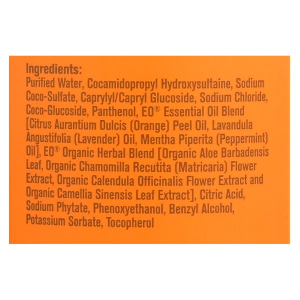ingredients : purified water;cocamidopropyl hydroxysultaine;sodium coco-sulfate;caprylyl/capryl glucoside;sodium chloride;coco-glucoside;panthenol;eo® essential oil blend [citrus aurantium dulcis;orange;peel oil;lavandula angustifolia;lavender;oil;menthe piperita;peppermint;oil];eo® organic herbal blend [organic aloe barbadensis leaf;organic chamomilla recutita;matricaria;flower extract;organic calendula officinalis flower extract and organic camellia sinensis leaf extract];citric acid;sodium phytate;phenoxye
