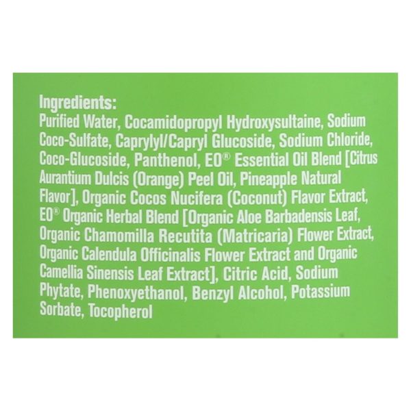 ingredients : purified water;cocamidopropyl hydroxysultaine;sodium coco-sulfate;caprylyl/capryl glucoside;sodium chloride;coco-glucoside;panthenol;eo® essential oil blend [citrus aurantium dulcis;orange;peel oil;pineapple natural flavor];organic cocos nucifera;coconut;flavor extract;eo® organic herbal blend [organic aloe barbadensis leaf;organic chamomilla recutita;matricaria;flower extract;organic calendula officinalis flower extract and organic camellia sinensis leaf extract];citric acid;sodium phytate;phen