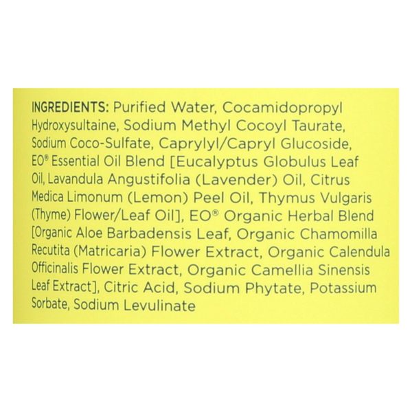ingredients : purified water;cocamidopropyl hydroxysultaine;sodium methyl cocoyl taurate;sodium coco-sulfate;caprylyl/capryl glucoside;eo® essential oil blend [eucalyptus globulus leaf oil;lavandula angustifolia;lavender;oil;citrus medica limonum;lemon;peel oil;thymus vulgaris;thyme;flower/leaf oil];eo® organic herbal blend [organic aloe barbadensis leaf;organic chamomilla recutita;matricaria;flower extract;organic calendula officinalis flower extract;organic camellia sinensis leaf extract];citric acid;sodium