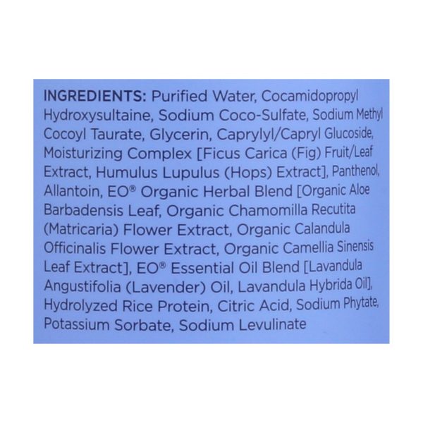 ingredients : purified water;cocamidopropyl hydroxysultaine;sodium coco-sulfate;sodium methyl cocoyl taurate;glycerin;caprylyl/capryl glucoside;moisturizing complex [ficus carica;fig;fruit/leaf extract;humulus lupulus;hops;extract];panthenol;allantoin;eo® organic herbal blend [organic aloe barbadensis leaf;organic chamomilla recutita;matricaria;flower extract;organic calandula officinalis flower extract;organic camellia sinensis leaf extract];eo® essential oil blend [lavandula angustifolia;lavender;oil;lavand