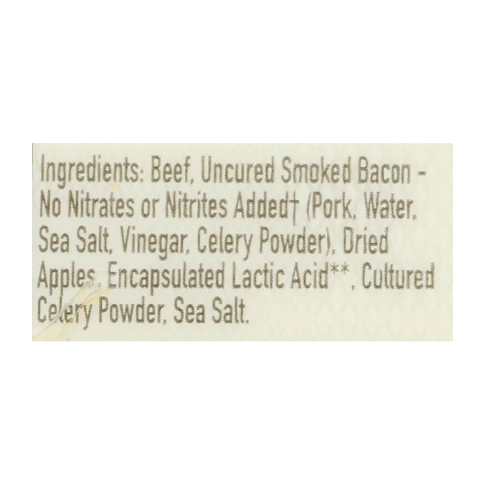 ingredients : beef;uncured smoked bacon – no nitrates or nitrites added† (pork, water, sea salt, vinegar, celery powder);dried apples;encapsulated lactic acid;cultured celery powder;sea salt