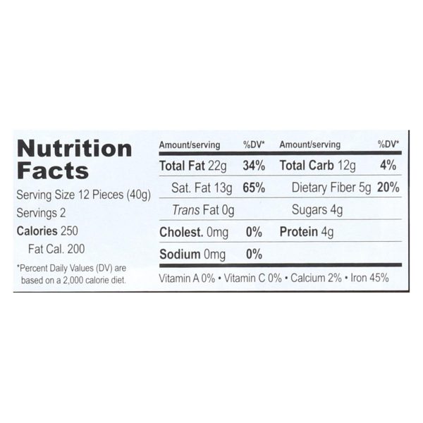 Small farmer chocolate bar, extreme dark chocolate is a rich and luxurious chocolate bar. Made with natural ingredients, this chocolate is free of unnatural and unnecessary additives. This product is kosher and organic. Each small farmer chocolate bar, extreme dark chocolate weighs 2.8 oz. With two servings per bar and 250 calories per serving.