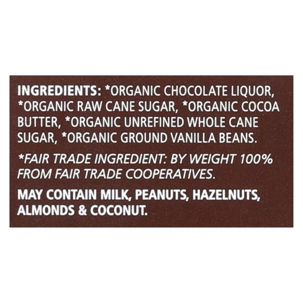 ingredients : organic chocolate liquor;organic raw cane sugar;organic cocoa butter;organic unrefined whole cane sugar;organic ground vanilla beans