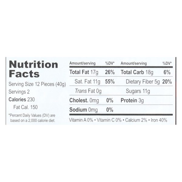 Small farmer chocolate bar, very dark chocolate is a rich and luxurious chocolate bar. Made with natural ingredients, this chocolate is free of unnatural and unnecessary additives. This product is kosher and organic. Each small farmer chocolate bar, very dark chocolate weighs 2.8 oz. With two servings per bar and 230 calories per serving.