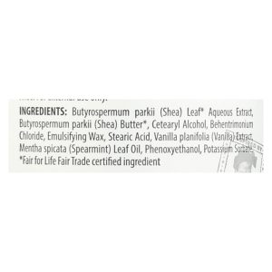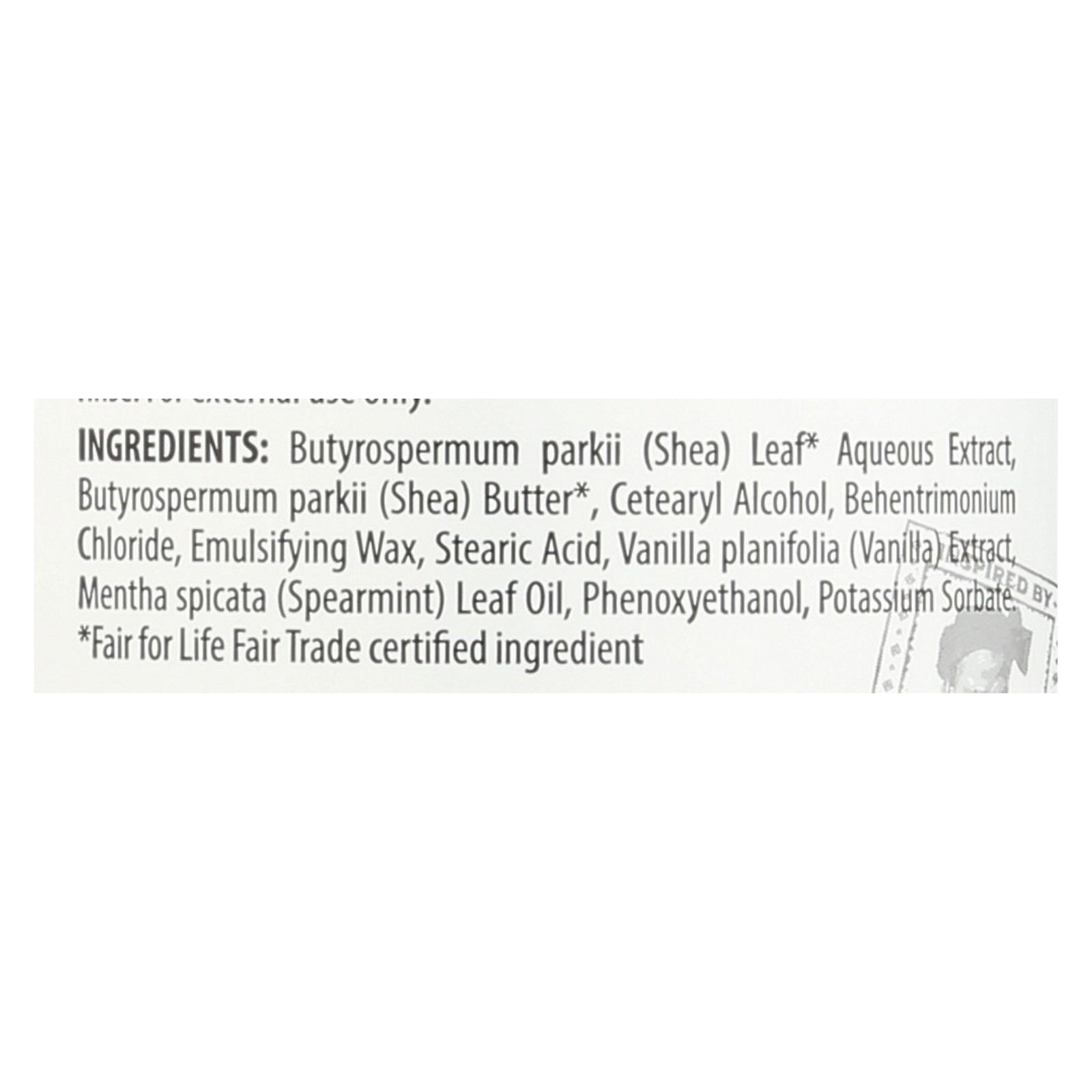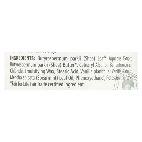 ingredients : butyrospermum parkii;shea;leaf aqueous extract;cetearyl alcohol;butter;behentrimonium chloride;emulsifying wax;stearic acid;vanilla planifolia;vanilla;extract;mentha spicata;spearmint;oil;phenoxyethanol;potassium sorbate