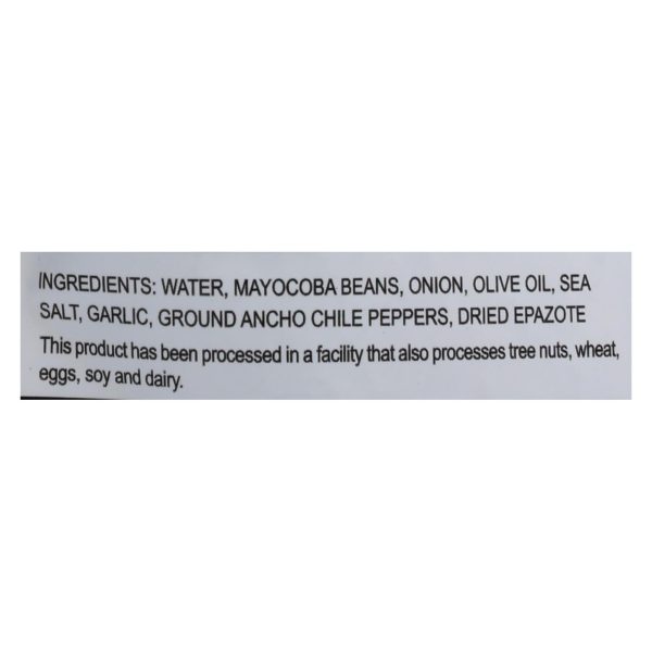 ingredients : water;mayocoba beans;onion;olive oil;sea salt;garlic;ground ancho chile peppers;dried epazote