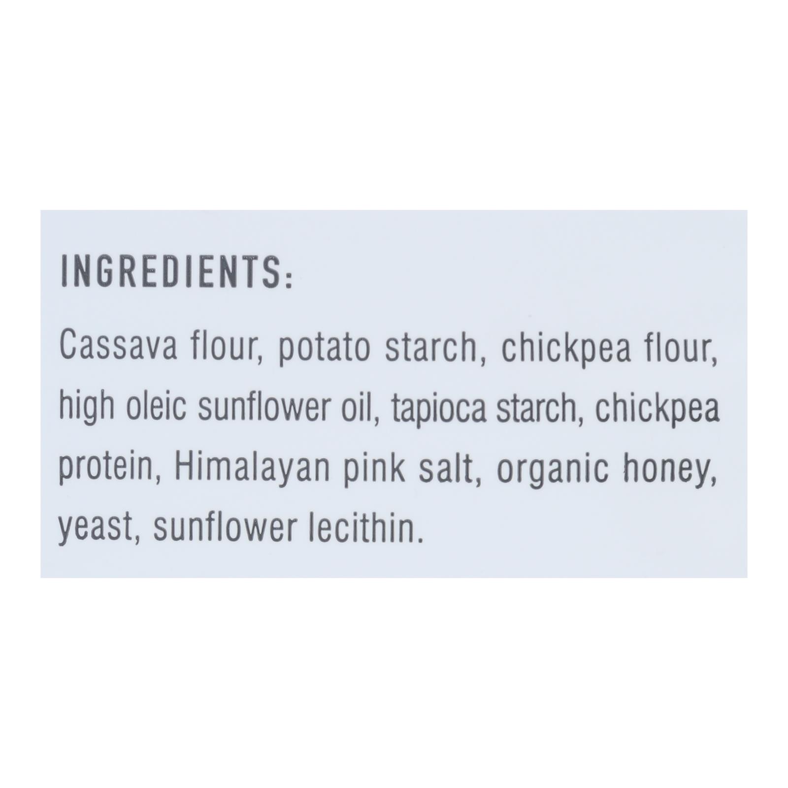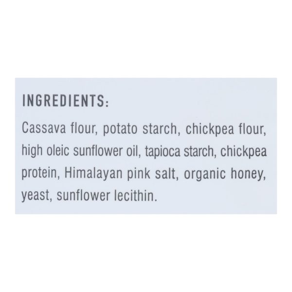 ingredients : cassava flour;potato starch;chickpea flour;high oleic sunflower oil;tapioca starch;chickpea protein;himalayan pink salt;organic honey;yeast;sunflower lecithin