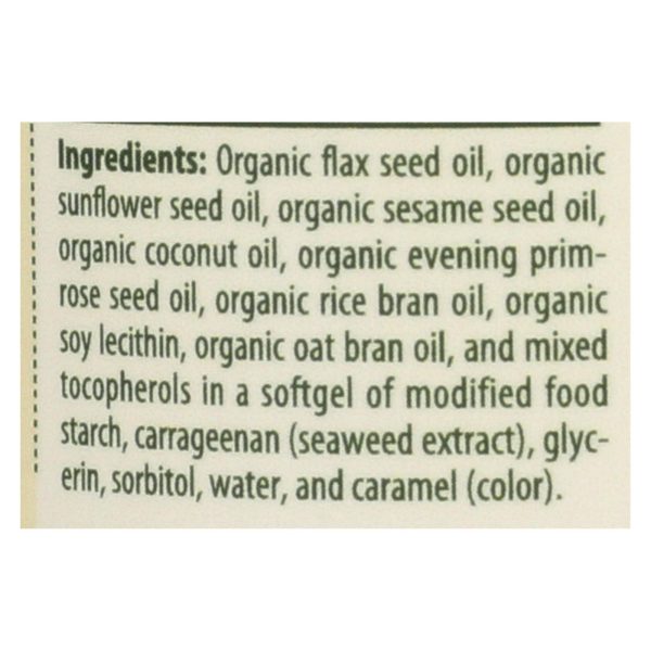 ingredients : organic flax seed oil;organic sunflower seed oil;organic sesame seed oil;organic coconut oil;organic evening primrose seed oil;organic rice bran oil;organic soy lecithin;organic oat bran oil;and mixed tocopherols in a softgel of modified food starch;carrageenan;seaweed extract;glycerin;sorbitol;water;and caramel;color