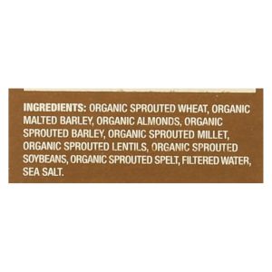ingredients : organic sprouted wheat;organic malted barley;organic almonds;organic sprouted barley;organic sprouted millet;organic sprouted lentils;organic sprouted soybeans;organic sprouted spelt;filtered water;sea salt