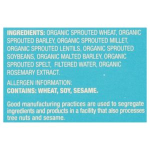 ingredients : organic sprouted wheat;organic sprouted barley;organic sprouted millet;organic sprouted lentils;organic sprouted soybeans;organic malted barley;organic sprouted spelt;filtered water;organic rosemary extract