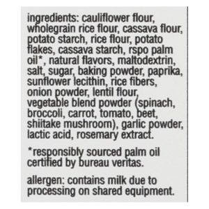 ingredients : cauliflower;whole grain rice;cassava;potato starch;rice flour;potato flakes;cassava starch;rspo palm oil;natural flavors;maltodextrin;salt;sugar;baking powder;paprika;sunflower lecithin;onion powder;lentil flour;vegetable blend;spinach;broccoli;carrot;tomato;beet;shiitake mushroom;garlic powder;lactic acid;rosemary extract