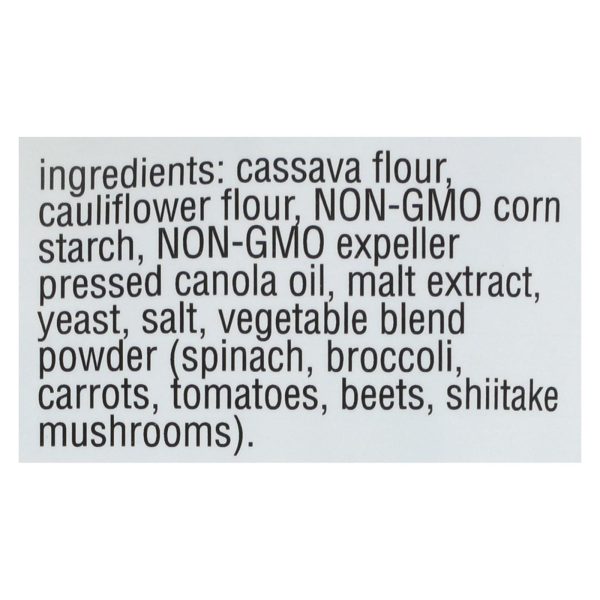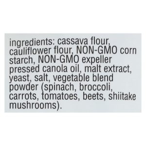ingredients : cassava;cauliflower;non-gmo corn starch;non-gmo expeller pressed canola oil;salt;vegetable blend;spinach;broccoli;carrot;tomato;beet;shiitake mushroom;yeast