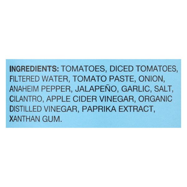 ingredients : tomatoes;diced tomatoes;filtered water;tomato paste;onion;anaheim pepper;jalapeño;garlic;salt;cilantro;apple cider vinegar;organic distilled vinegar;paprika extract;xanthan gum