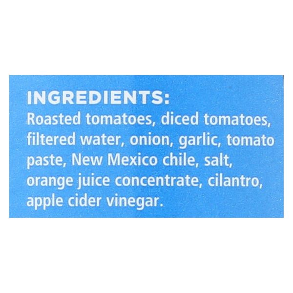 ingredients : roasted tomatoes;diced tomatoes;filtered water;onion;garlic;tomato paste;new mexico chile;salt;orange juice concentrate;cilantro;apple cider vinegar