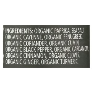 ingredients : organic paprika;sea salt;organic cayenne;organic fenugreek;organic coriander;organic cumin;organic black pepper;organic cardamom;organic cinnamon;organic cloves;organic ginger;organic turmeric