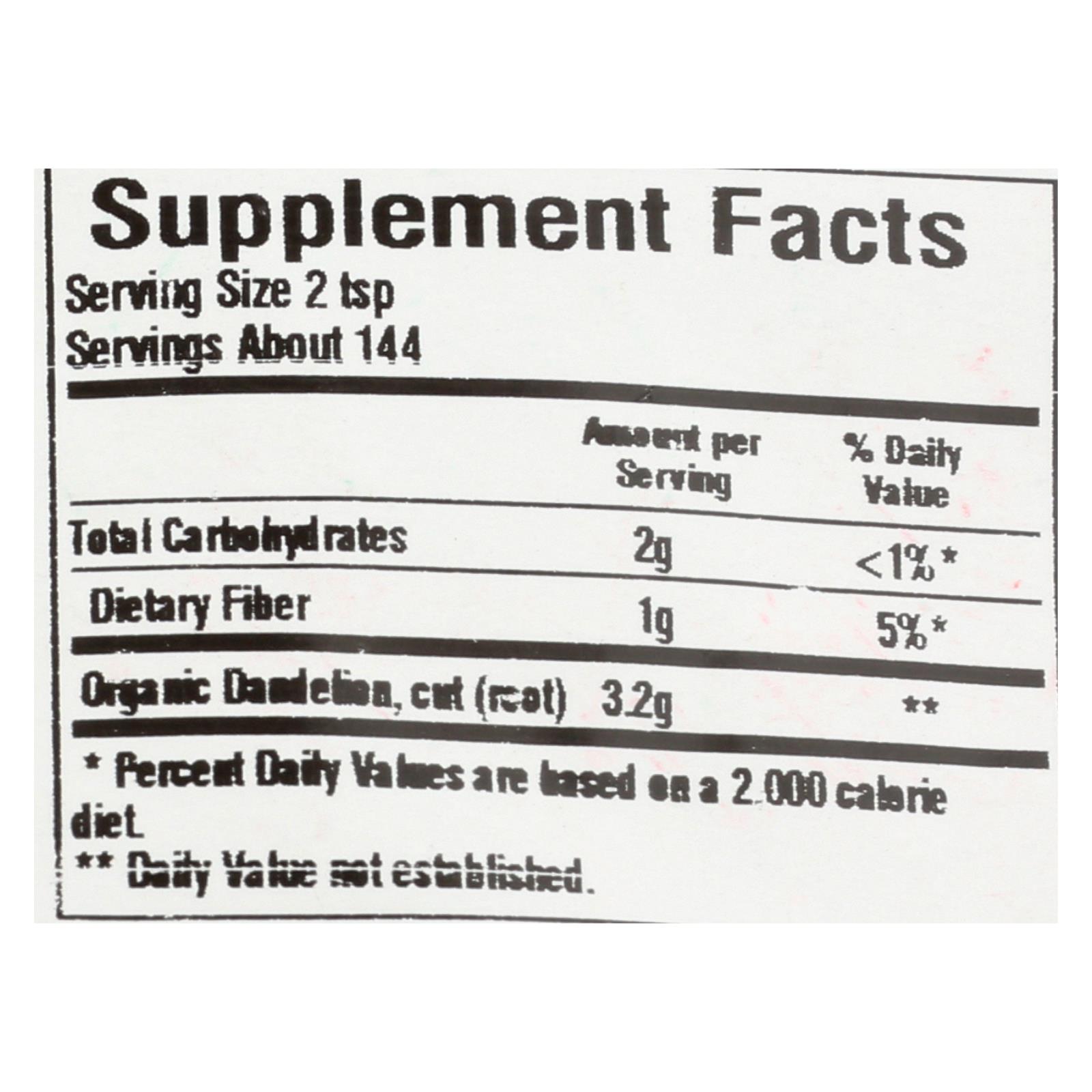 Frontier natural products co-op cut & sifted organic dandelion root is a natural, tasty herbal supplement designed to be added to food in small amounts to add flavor and nutritional value. Full of vitamins and minerals and associated with cleansing action, you can stir the fresh, pre-cut herb from this 16 oz. Bag into salads, meat dishes, stews and even drinks.