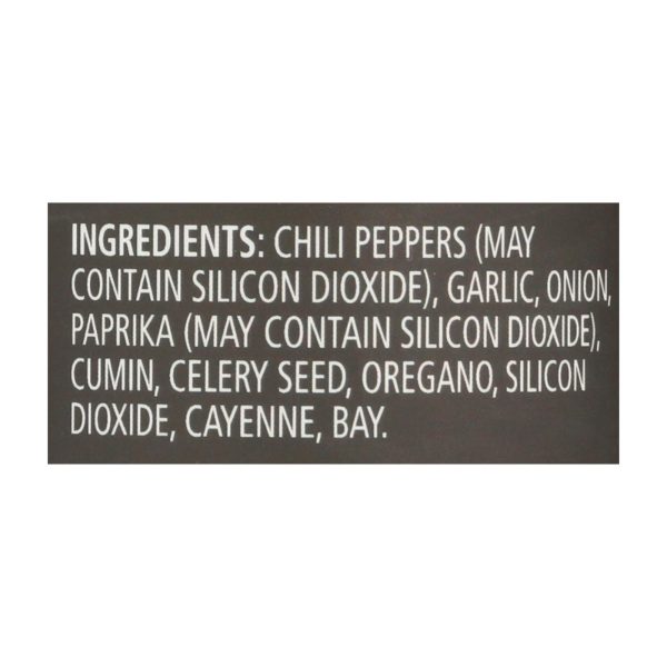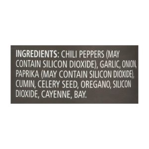 ingredients : chili peppers;may contain silicon dioxide;garlic;onion;paprika;cumin;celery seed;oregano;silicon dioxide;cayenne;bay