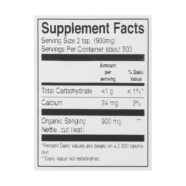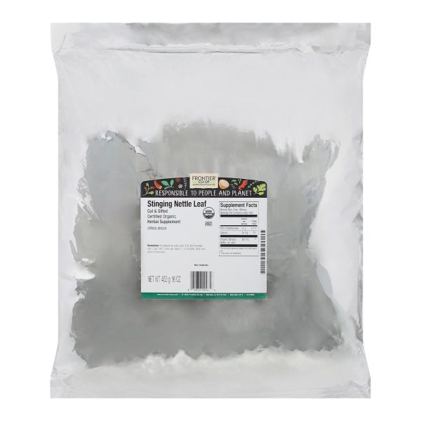 Herbal supplement. Usda organic. Certified organic. Certified organic by qai. Member owned since 1976. Responsible to people and planet. Cut & sifted. Urtica dioica. Non-irradiated. Www.frontiercoop.com.