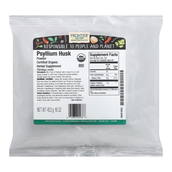 Herbal supplement. Usda organic. Certified organic by qai. Certified organic. Frontier co-op member owned since 1976. Responsible to people and planet. Plantago ovata. Www.frontiercoop.com.
